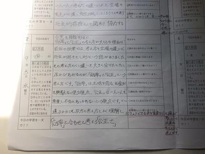 今日の授業で学習したことと前の時間に学習したことを結び付けて考え、なぜ効率と公正の2つの視点で考える必要があるのかについて自分の考えをまとめている様子がうかがえました。